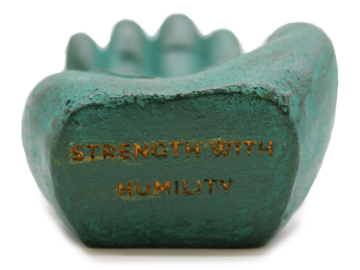 This Stone Hand Ashcatcher is perfect for catching falling ashes, protecting surfaces and making the ashes easy to dispose of. This green design include the text "Strength with Humility," highlighting the power derived from grounded and humble beginnings,