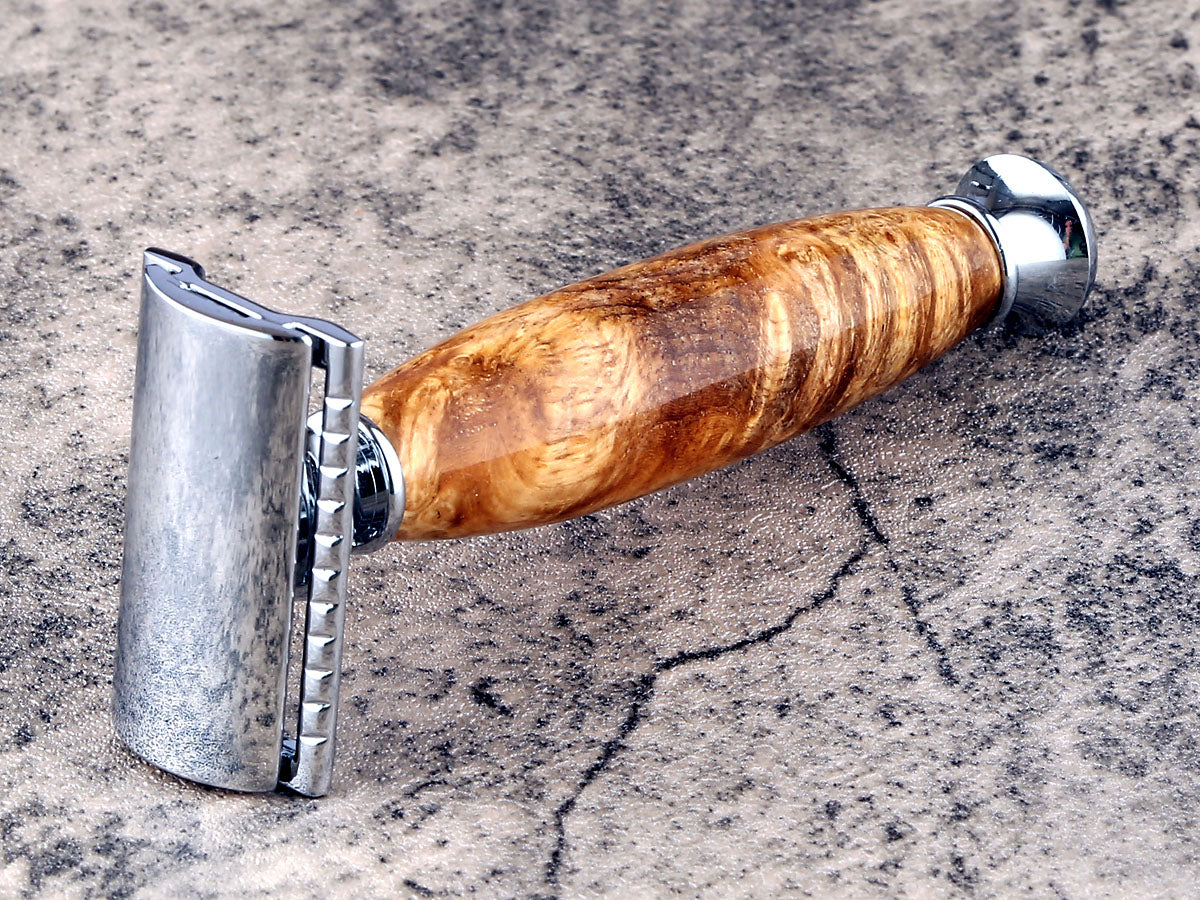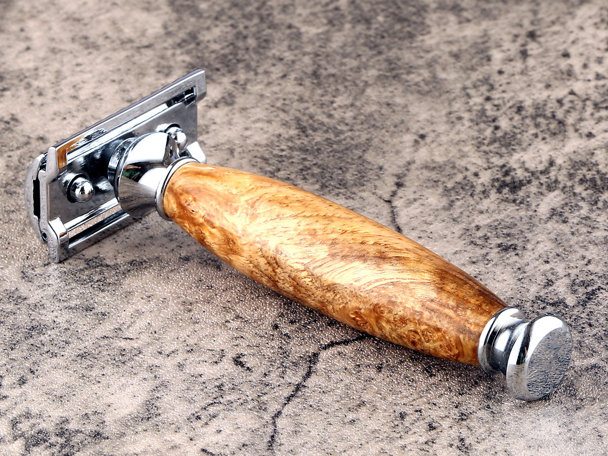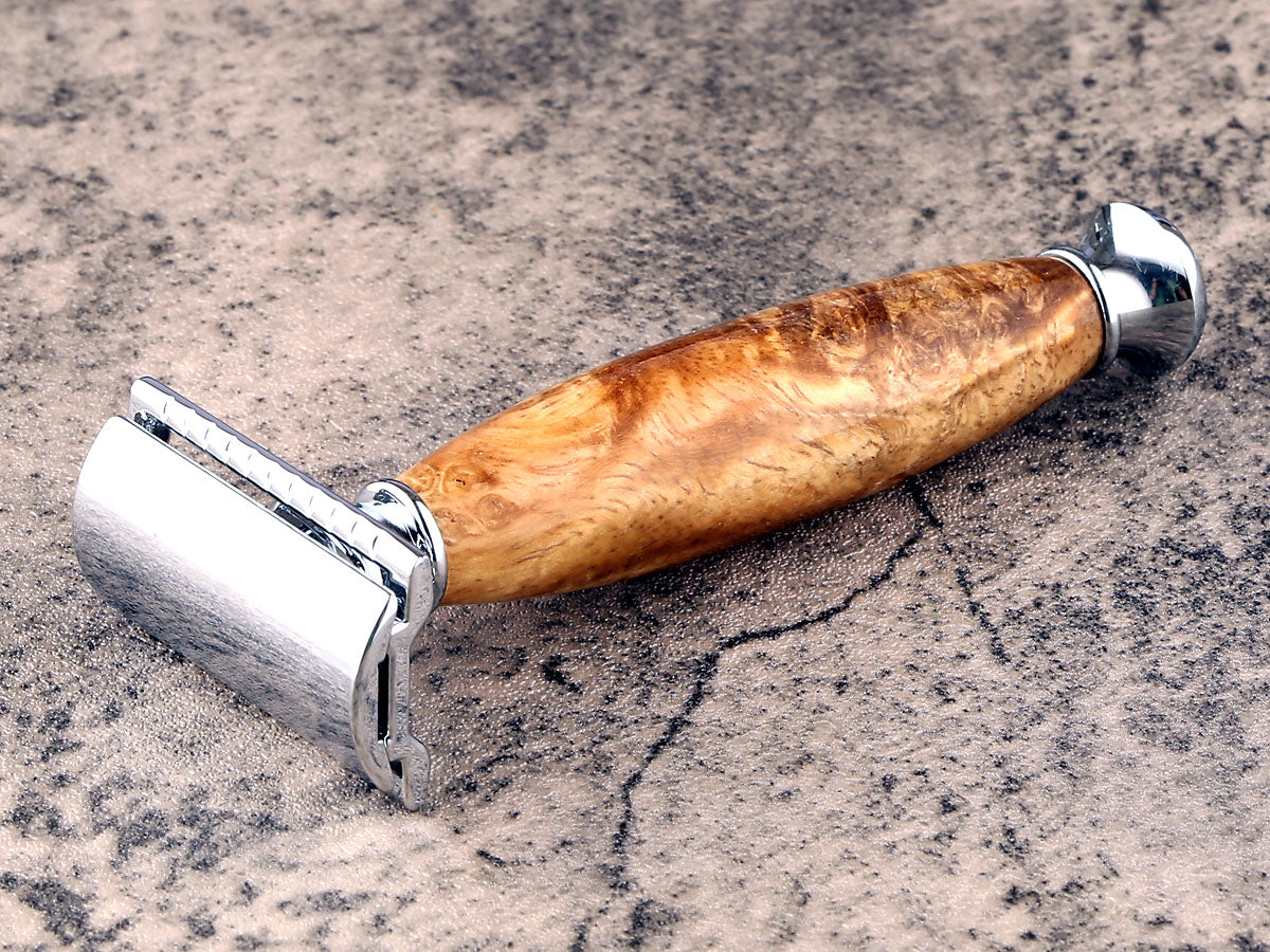 This beautiful Amboyna Burl Wood Safety Razor features a closed comb design, for a comfortable shave in style.