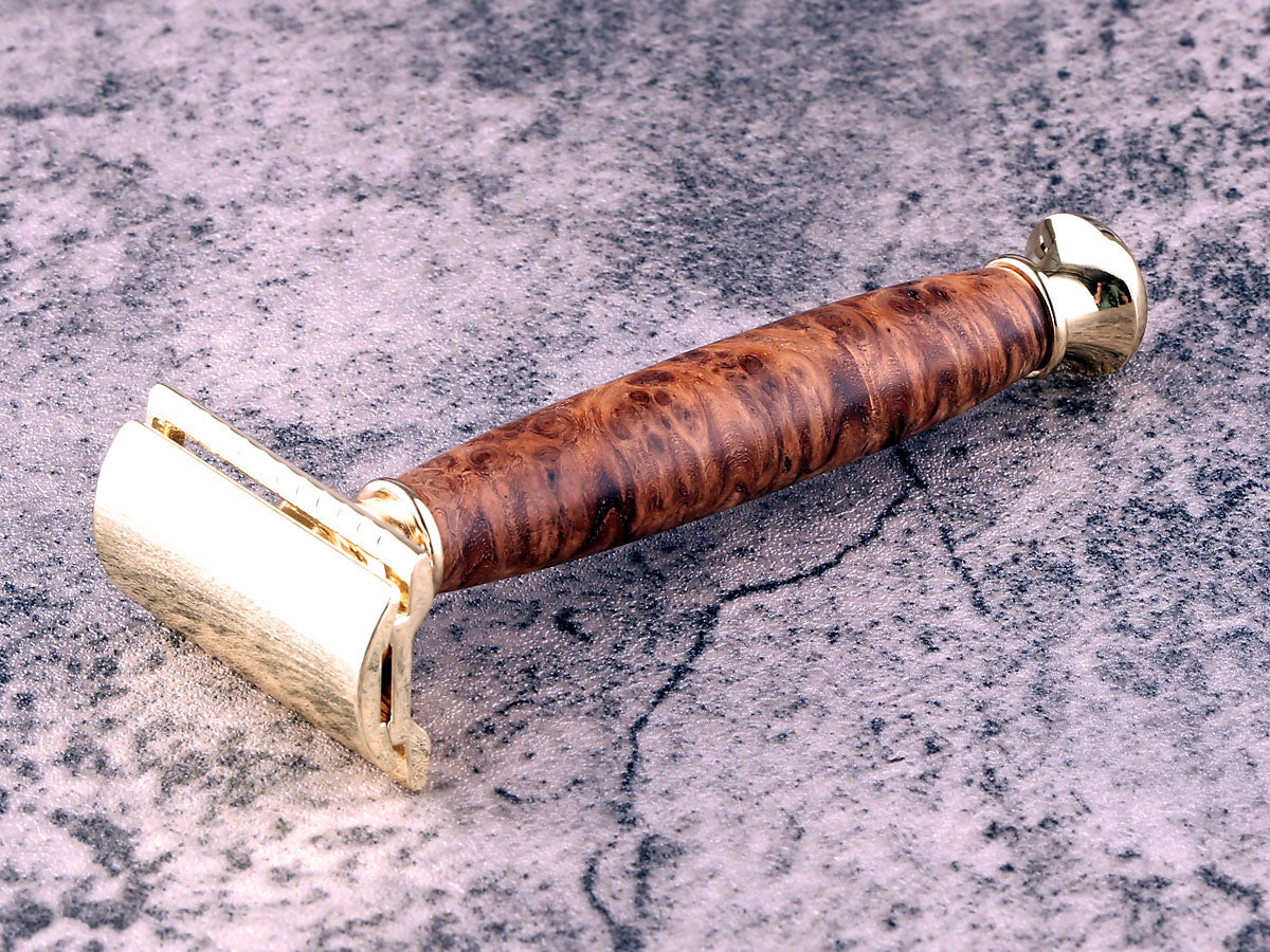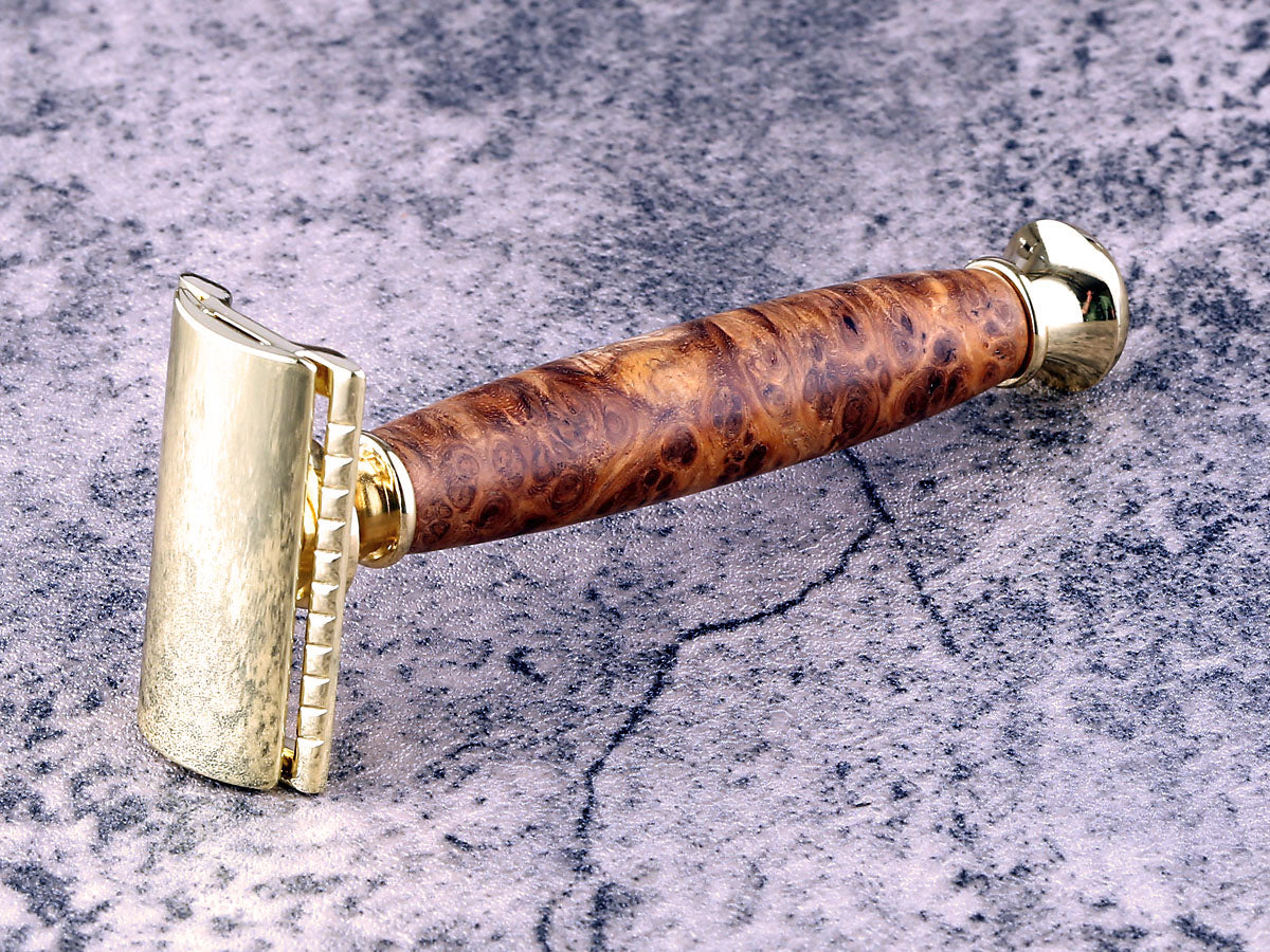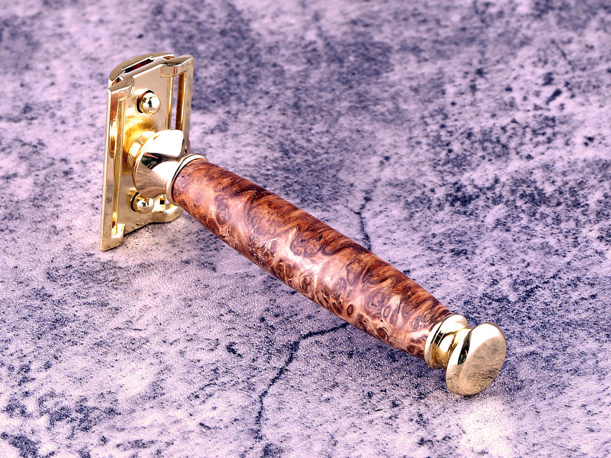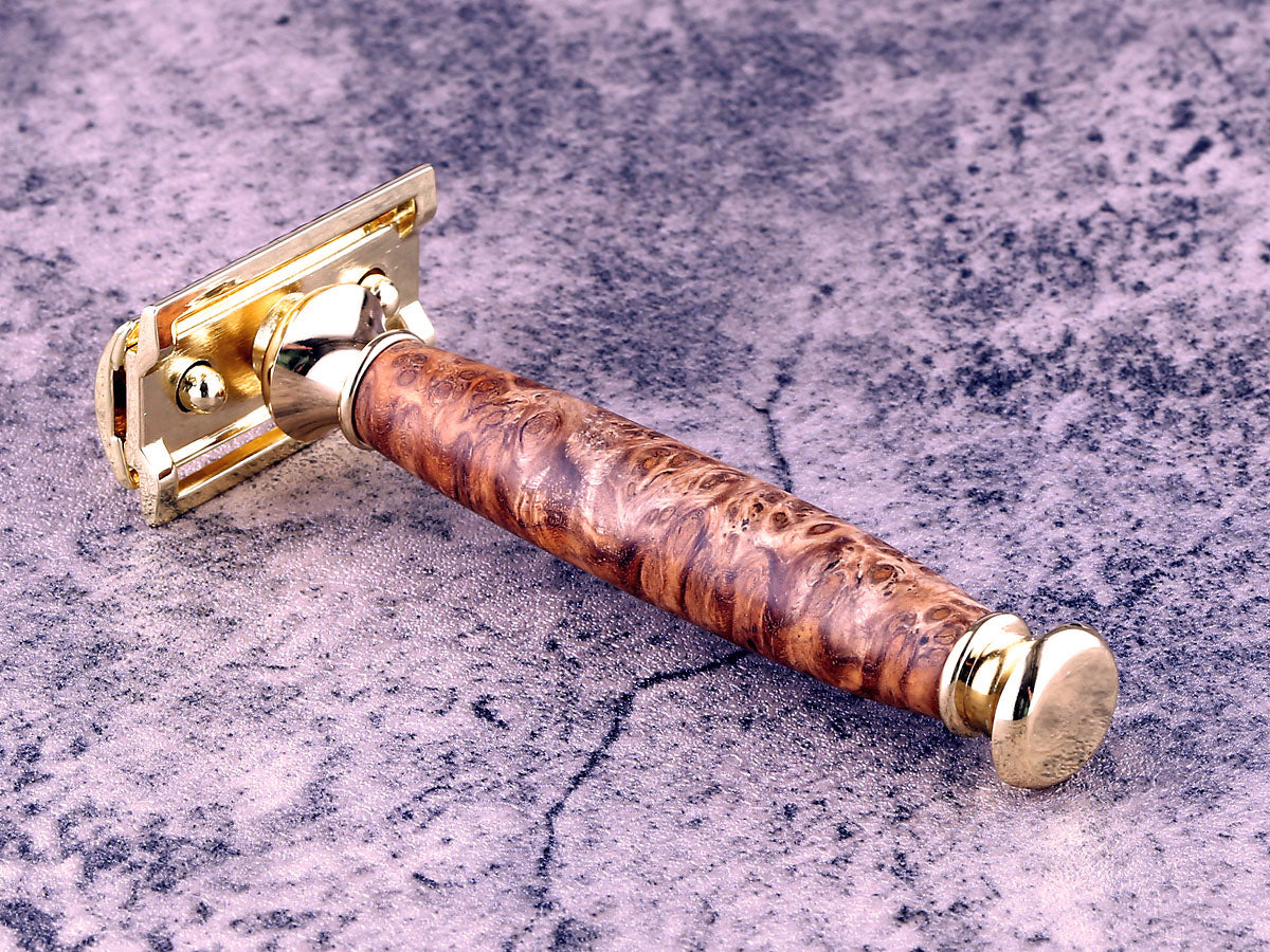 This beautiful Chechen Burl Wood Safety Razor features a closed comb design, for a comfortable shave in style.