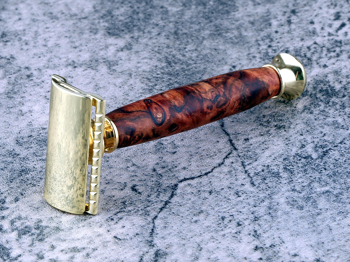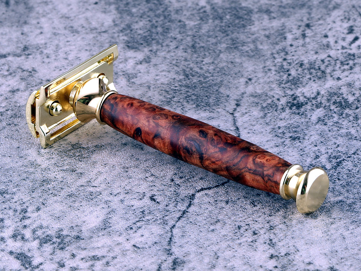 This beautiful Chechen Burl Wood Safety Razor features a closed comb design, for a comfortable shave in style.