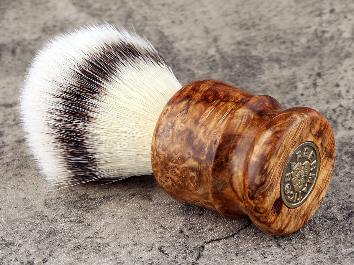 This deluxe shaving brush has been fashioned from 2-toned Amboyna Burl with gold and orange colours. Set with a 24mm synthetic knot with a 60mm loft or if you prefer to use your own shaving brush knot, a handle only option is also available.